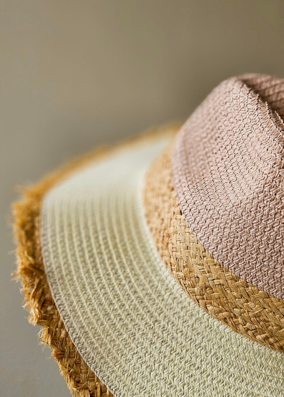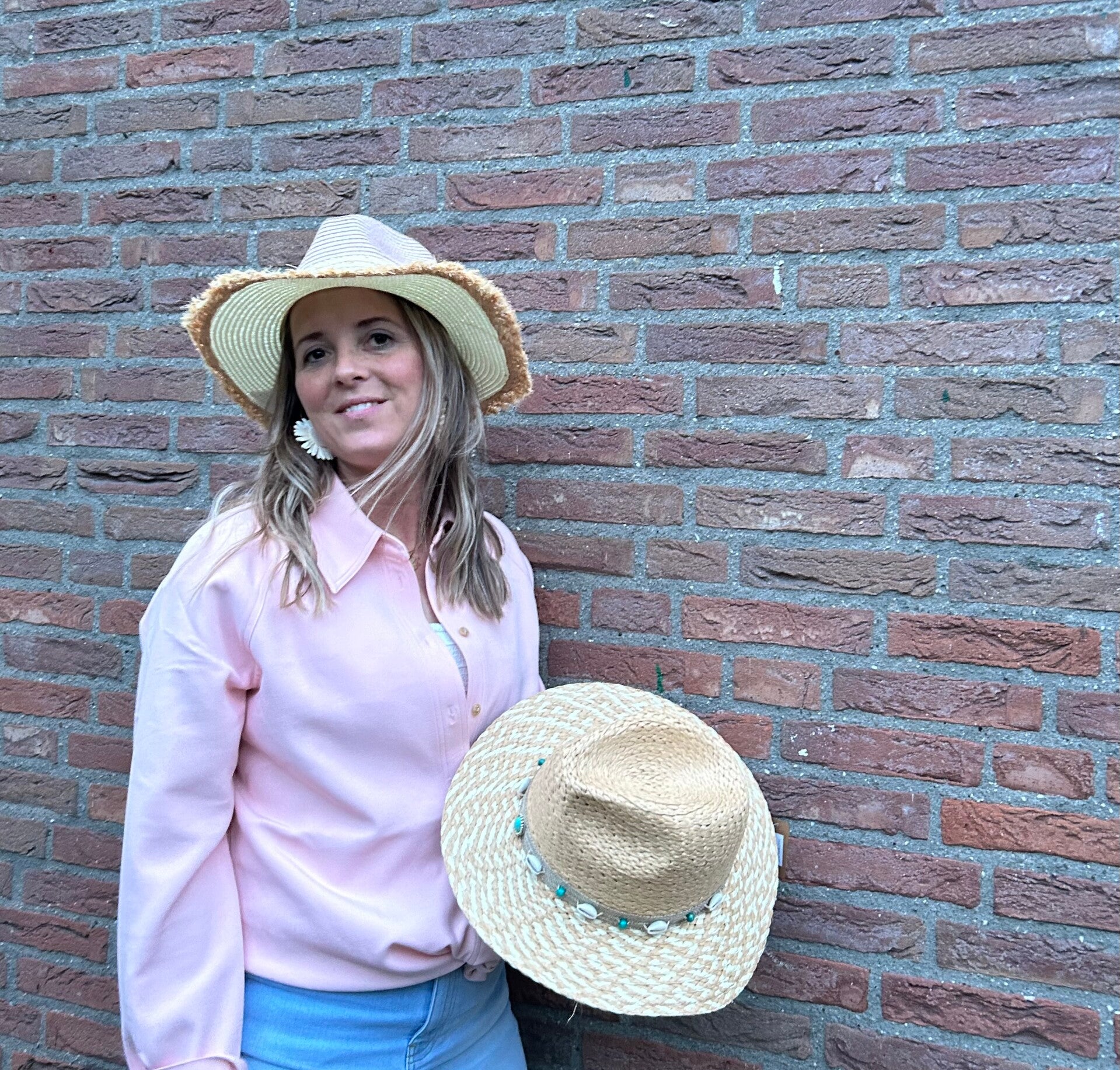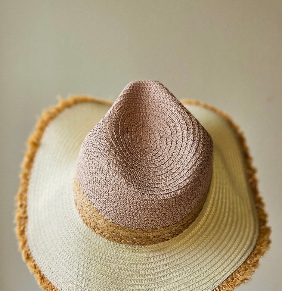 Mooie zomerhoed in roze / beige kleuren. De hoed is maat M, geschikt voor een hoofdomtrek van 56 – 58 cm.