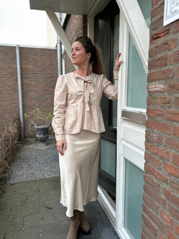 Beige/champagne glans rok, feestelijk maar ook sportief met een sneaker te dragen.