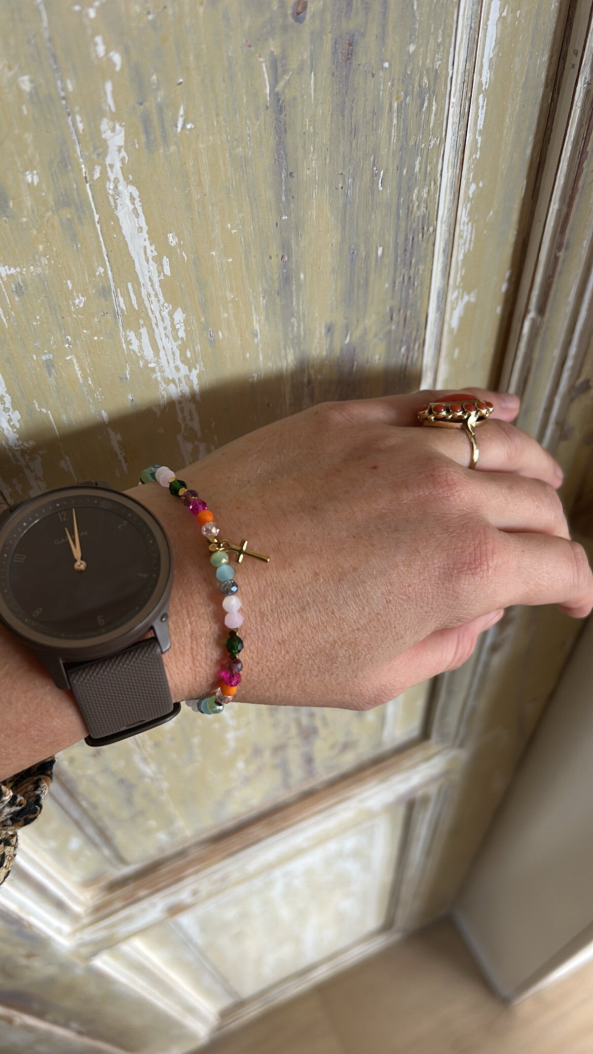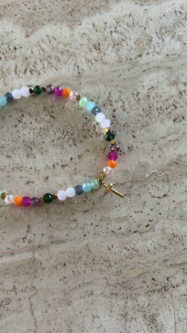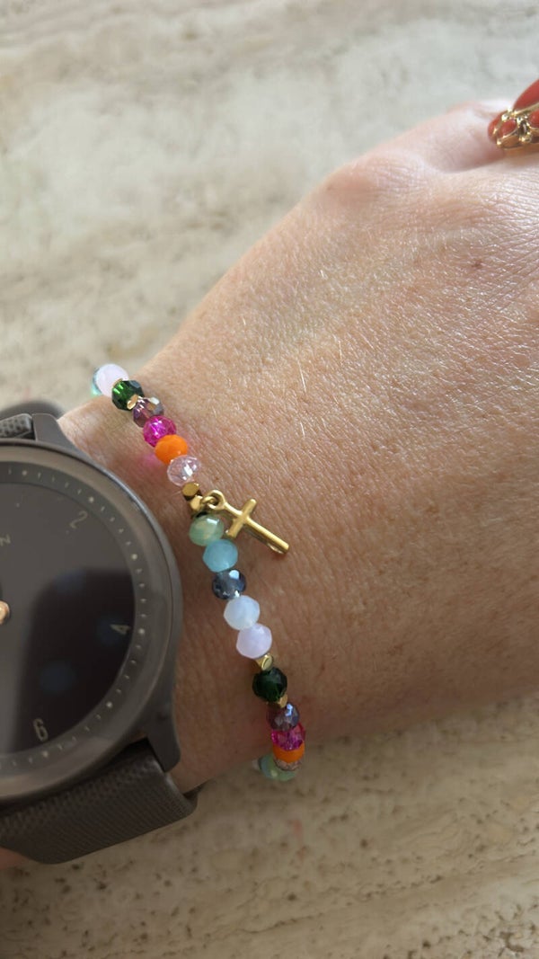 Dit fleurige armbandje met vrolijke kralen en een subtiel kruisje is een mooi symbool van je geloof. Draag het als een dagelijkse herinnering aan kracht, vertrouwen en verbinding. Het armbandje voegt niet alleen kleur toe aan je outfit, maar ook betekenis aan je dag.