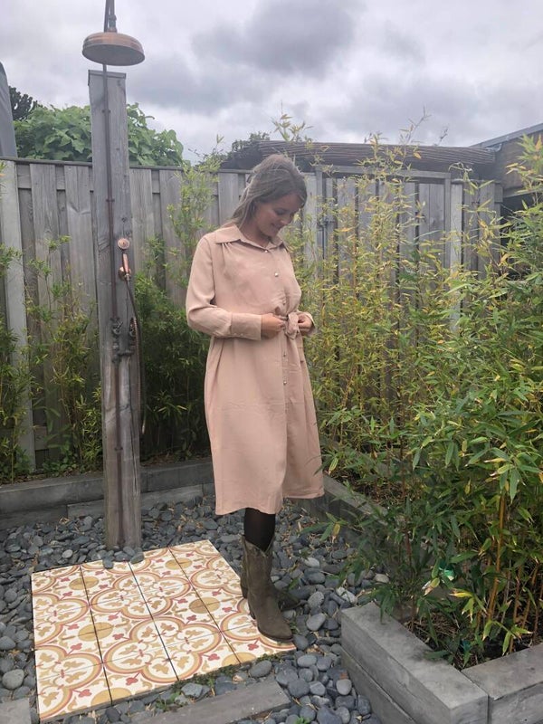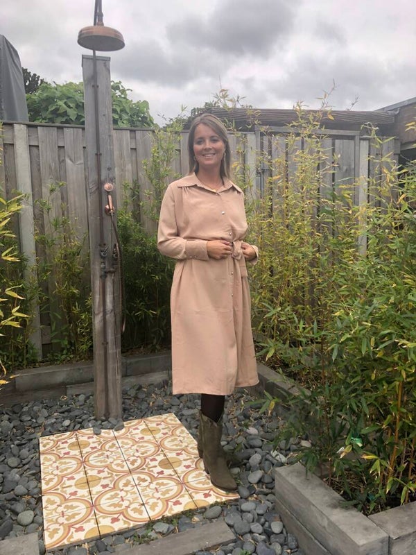 Prachtige beige jurkmet mooie zilveren knoopjes.