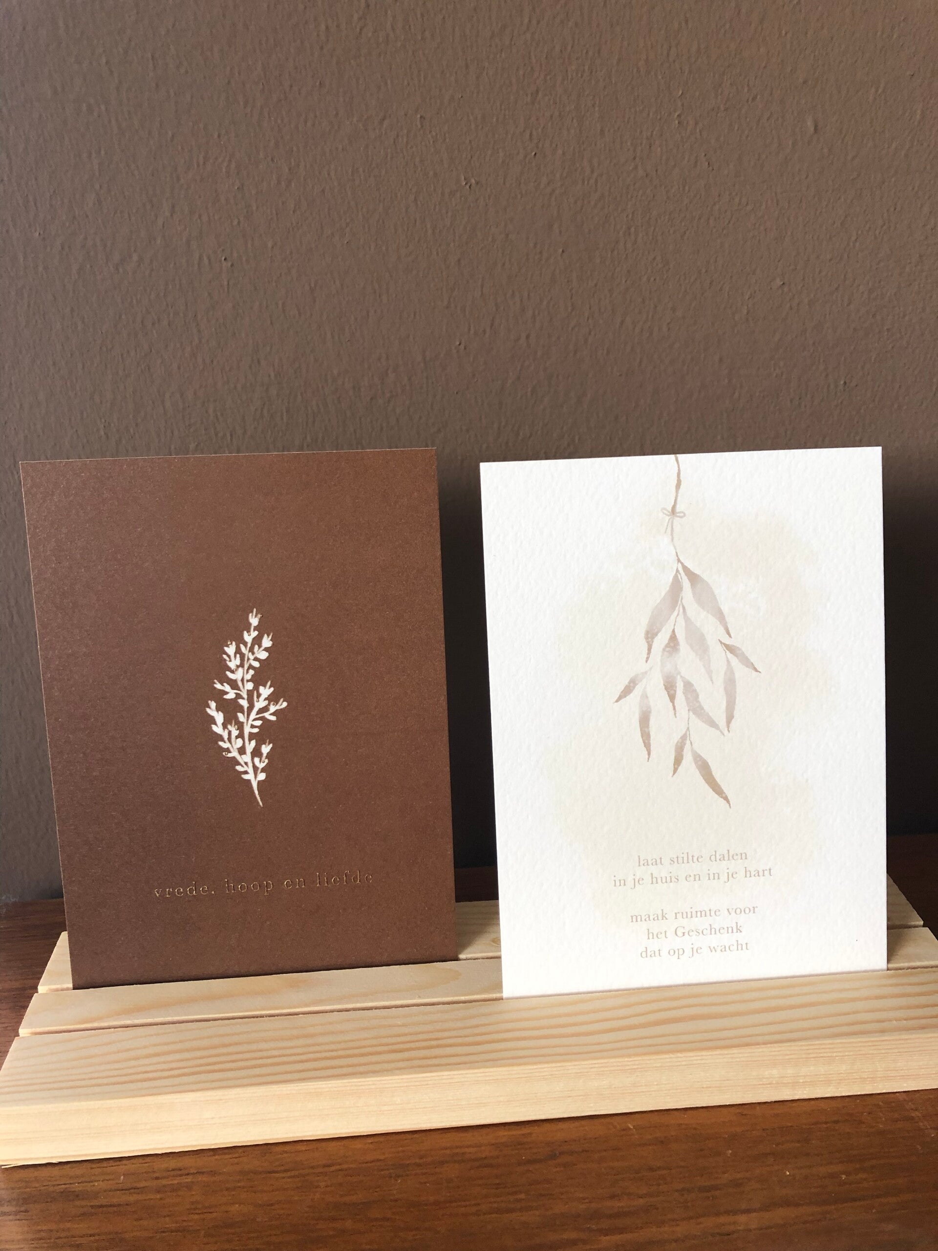 Kaarthouder van vurenhout, met 2 kaartgleuven. Hierdoor kun je kaarten leuk met elkaar combineren. Afmetingen van deze kaarthouder zijn 25 x 7 x 1,5 cm. Omdat het product van vurenhout is gemaakt, ziet elke kaarthouder er net weer wat anders uit qua nerven en houtkleur. De ruimte tussen de twee kaartgleuveb is 2 cm.