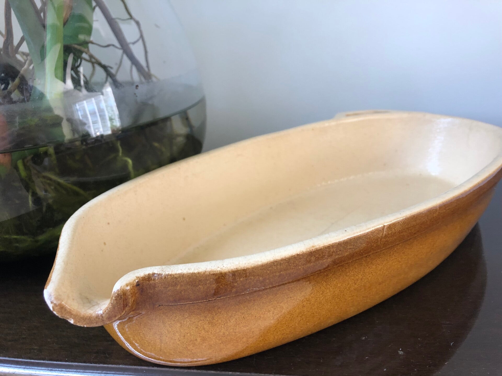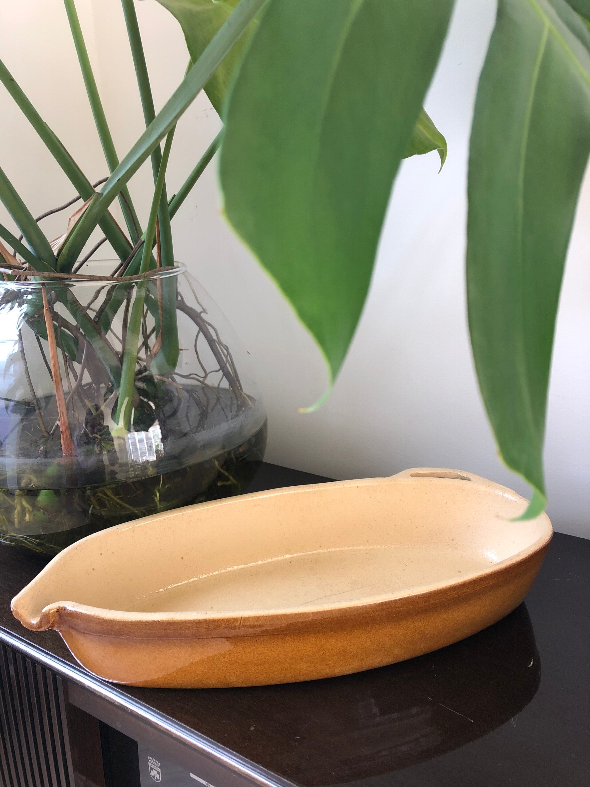 Vintage ovenschaal maar ook super orgineel met kerstballen straks of drijfplanten
