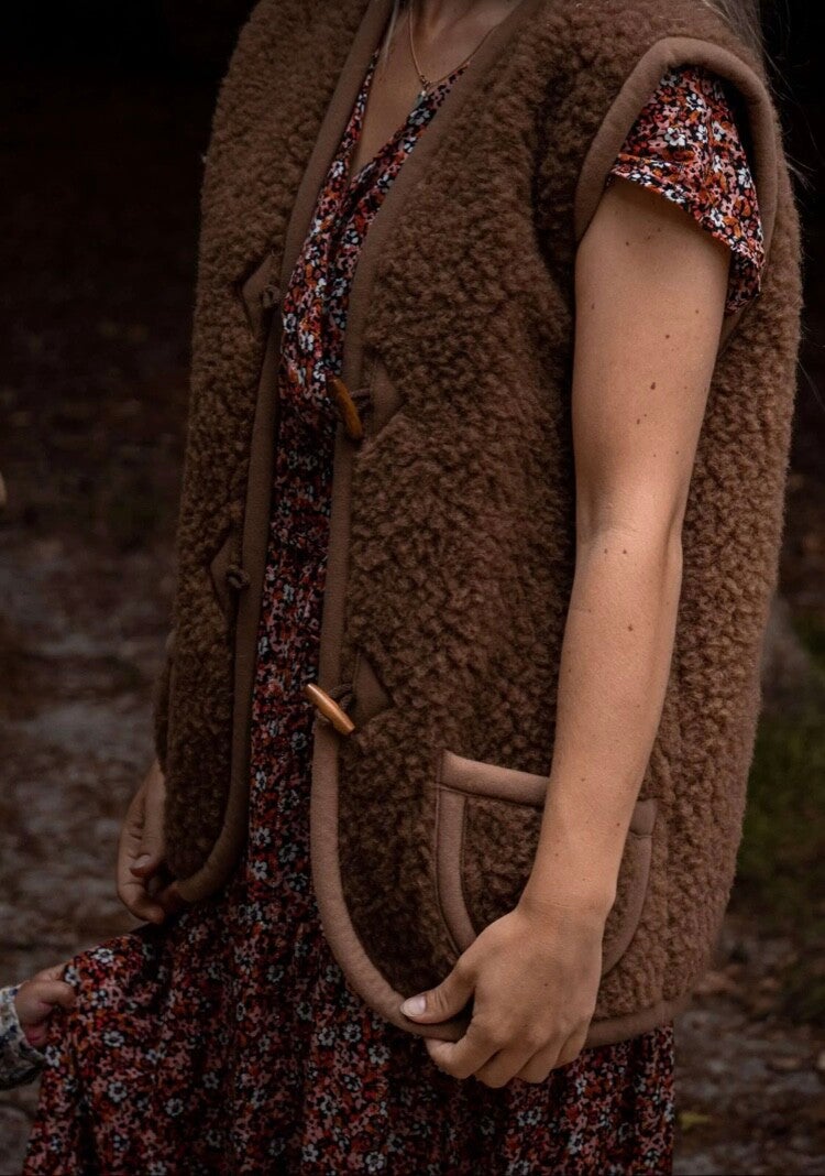 Deze 100% merino wollen bodywarmer donkerbruin zijn handgemaakt, met respect voor dier en milieu. Alle wol komt bij kleine boerderijen vandaan waar de schapen vrij rond kunnen lopen.