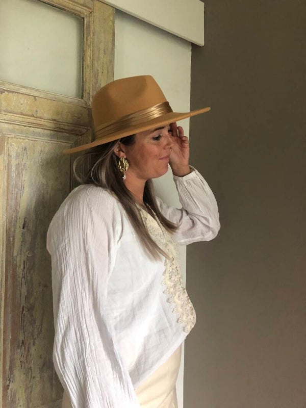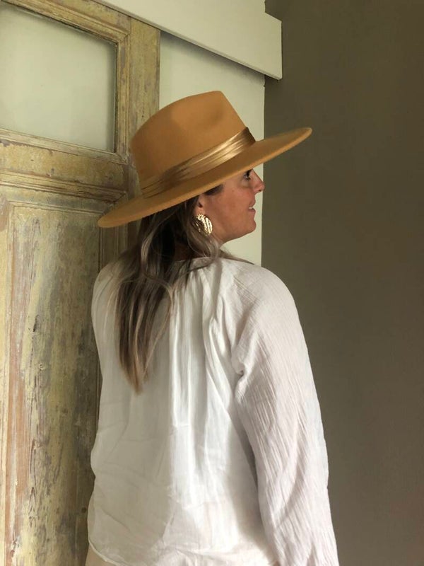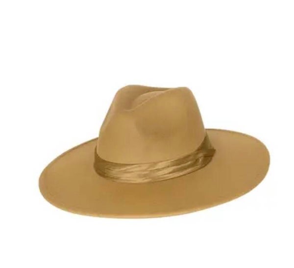 Beige hoed met een mooie glans ceintuur eromheen. De hoed is te stellen aan de binnenkant.